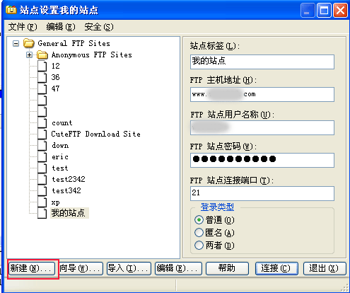 | | 3,我站點設置中點“新建”,站點標簽任意設置一個名字,FTP主機地址填自己的域名; 填入ftp站點用戶名稱和密碼,ftp連接口用默認的21,登錄類型選擇為“普通”。