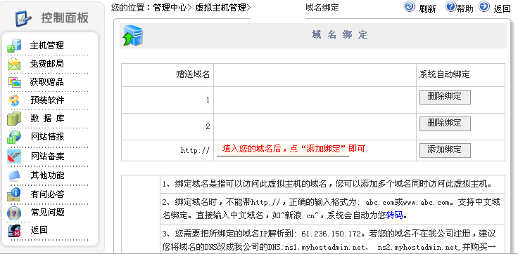 如何將域名和虛擬主機綁定?- 虛擬主機,虛擬主機域名注冊-常見問題,虛擬主機,網頁制作,域名注冊,主機,企業郵局,主頁空間,個人主頁,網絡實名,主機托管,網站建設,域名">