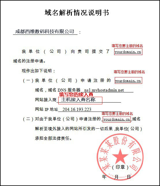填寫時,僅需要將“yourdomain.cn”替換為您需要注冊的域名即可,其他地方不做修改,印章處需加蓋公司公章,如果是個人用戶注冊,在印章處簽名即可,日期填寫申請注冊時的日期。填寫后將文檔掃描了發到郵箱service@greatidc.com 即可。 申請后需要cnnic處理,一般需要3~5個工作日開通。