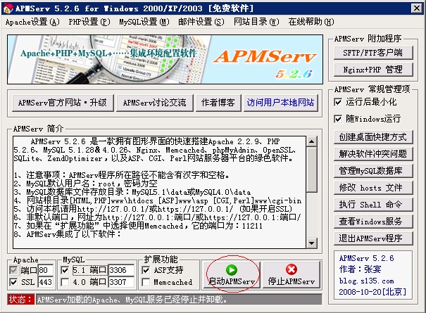 軟件說明: APMServ 5.2.6 是一款擁有圖形界面的快速搭建Apache 2.2.9、PHP 5.2.6、MySQL 5.1.28&4.0.26、Nginx 0.7.19、Memcached 1.2.4、phpMyAdmin 2.11.9.2、OpenSSL、SQLite、ZendOptimizer,以及ASP、CGI、Perl網站服務器平臺的綠色軟件。無需安裝,具有靈活的移動性,將其拷貝到其它目錄、分區或別的電腦時,均只需點擊APMServ.exe中的啟動按鈕,即可自動進行相關設置,將Apache和MySQL安裝為系統服務并啟動。APMServ集合了Apache穩定安全的優點,并擁有跟IIS一樣便捷的圖形管理界面,同時支持MySQL 5.0 & 4.0兩個版本,虛擬主機、虛擬目錄、端口更改、SMTP、上傳大小限制、自動全局變量、SSL證書制作、緩存性能優化等設置,只需鼠標一點即可完成。