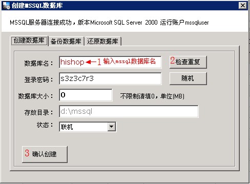 2.輸入mssql數據庫名,點擊右側的“檢查重復”檢查下是否已經存在這個數據庫。密碼為了保證復雜性,可以使用系統自動生成的密碼,不做修改。然后點“確認創建”。