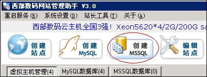 VPS/云主機用網站管理助手建立、還原、備份mssql首先請確保您的服務器使用的是我司默認的環境配置且MSSQLSERVER服務處于運行狀態,如果您是自己手工配置的環境,則以下操作可能會報錯或失敗。 Mssql的建立: 1.打開我司網站管理助手,點擊“創建mssql”
