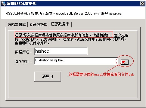 2.點擊“還原數據庫”,在備份文件右側點擊按鈕選擇需要還原的bak備份文件,(操作前請檢查下原數據庫中是否有需要的數據,請對重要數據做好備份,再進行還原操作,以免重要數據被覆蓋。)點還原即可。