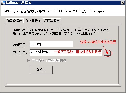 Mssql的備份: 雙擊需要備份的數據庫,打開操作面板,點擊“備份數據庫”,在“保存路徑”那選擇需要保存的位置(建議保持默認路徑),點擊“備份”。