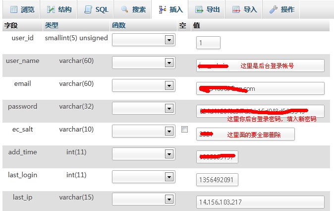 在password這行填入新的密碼, 如:md5加密字串:0192023a7bbd73250516f069df18b500 md5加密字串:0192023a7bbd73250516f069df18b500 就是密碼:admin123 同時(shí)要注意,把ec_sale 這行里面的數(shù)字全部刪除,不然的話修改是不能成功的。