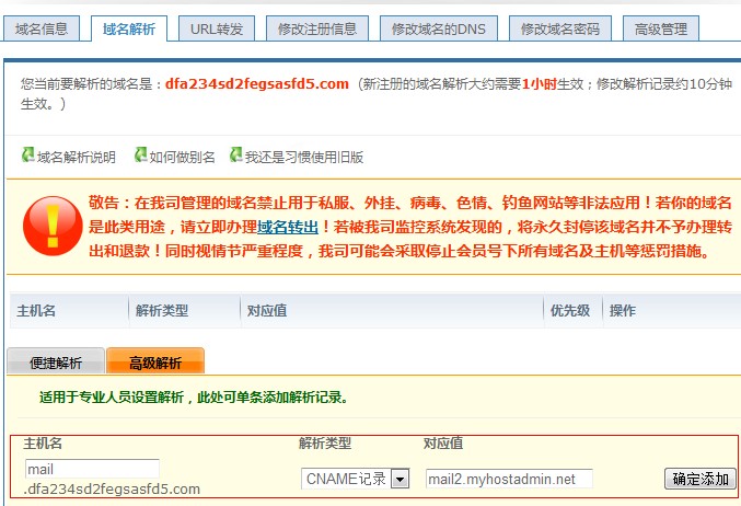 2.點擊"域名解析",在解析類型選擇cname記錄,在主機名處輸入mail,對應值處輸入我司郵局對應的域名,如下界面:
